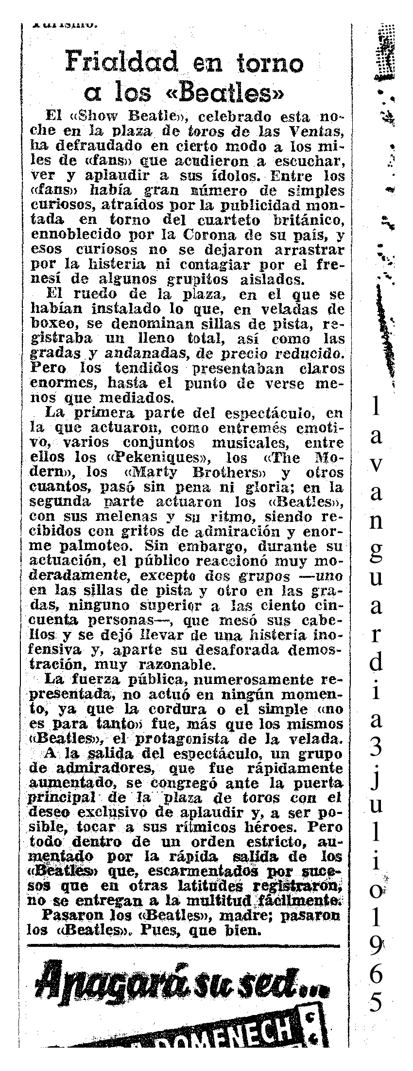 En 1965, la beatlemania comenzaba a airearse tímidamente en los medios de comunicación, fundamentalmente en la radio. Desde la Cadena Ser, Joaquín Luqui, Tomás Martín Blanco o Rafael Revert corrían a Londres a comprar los nuevos discos de los Beatles, porque en España era impensable encontrarlos. Rafael Revert cree que tanto el precio como el clima de miedo influyeron en el escaso número de personas que acudió a la plaza de toros. «Además, los fans de aquella época no estaban acostumbrados a este tipo de conciertos. Los que fueron a aquél eran fans de pura cepa. No hubo ni siquiera periodistas». Sobre Lennon, Revert opina: «Era, junto con Paul Mac Cartney, el puntal del grupo, sus composiciones, sus mensajes, llegaron a millones de personas de todo el mundo y supusieron una ruptura generacional incluso superior a la que produjo Elvis Presley. Los Beatles cambiaron no sólo la música, sino la forma de vestirse y otras formas de conducta juvenil». (José F. Beaumont, El País, 10-12-80, http://goo.gl/o3dNrX)